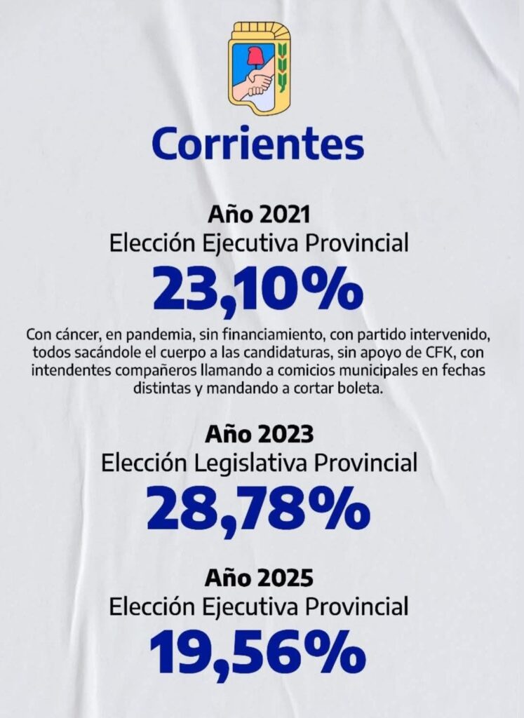 La comparación con elecciones anteriores habla por sí sola. En 2021, en medio de un contexto adverso —pandemia, partido intervenido, sin financiamiento, sin apoyo de Cristina Fernández de Kirchner y con jefes comunales cortando boleta— el justicialismo alcanzó el 23,10%. Dos años más tarde, en 2023, en las legislativas provinciales, el espacio logró recuperarse parcialmente con un 28,78%. Sin embargo, el desplome de 2025 confirma una crisis política profunda.