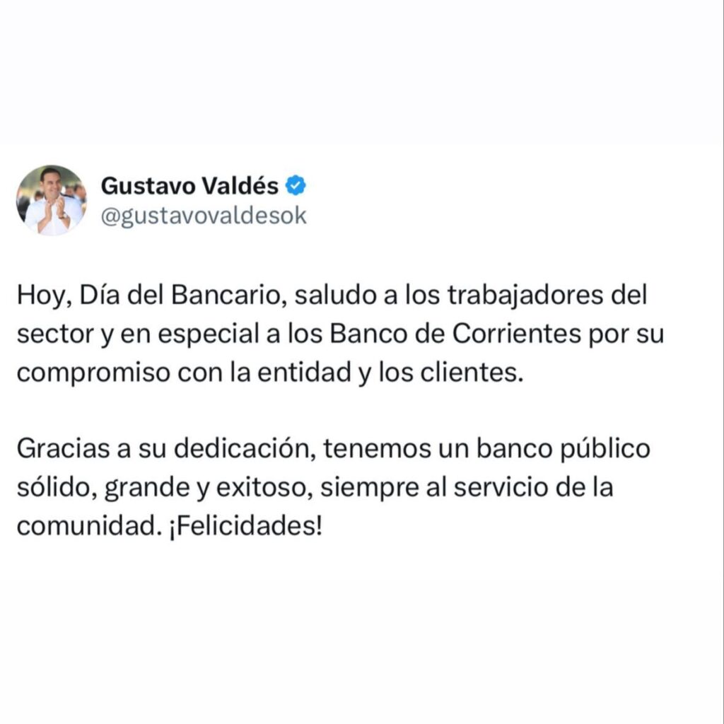 En el marco del Día del Bancario, el gobernador Gustavo Valdés expresó su reconocimiento a