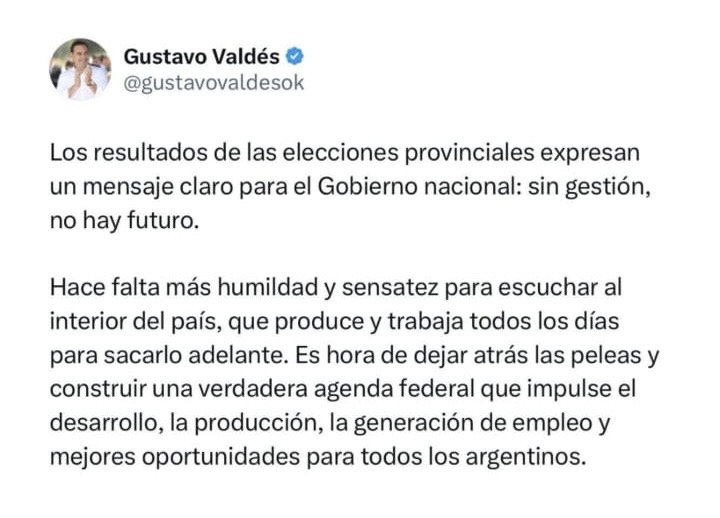 DURA DERROTA DE MILEI: GUSTAVO VALDÉS LLAMA A LA HUMILDAD Y SENSATEZ.
