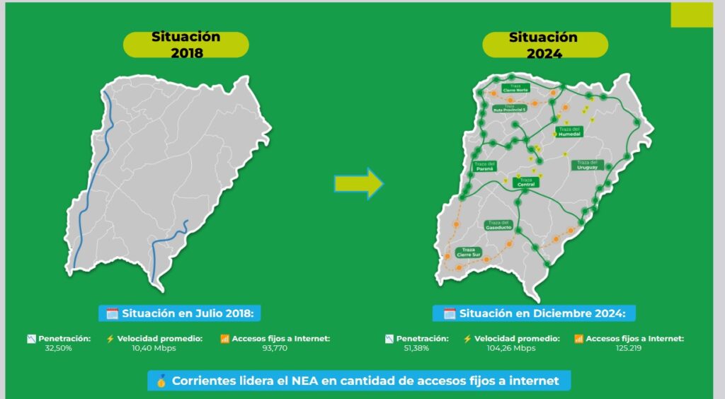 «En julio del 2018, la provincia de Corrientes, con una población de 1.101.084 habitantes poseía una penetración de 32,50% y velocidad de 10,40 Mbps y 93.770 accesos fijos a Internet, se ubicaba entre las provincias con menor acceso a banda ancha por habitante, de acuerdo al diagnóstico realizado en articulación entre el Ministerio de Coordinación y Planificación y el Ministerio de Modernización de la Nación. El desafío que se planteó el Gobierno Provincial fue el de mejorar la penetración y la velocidad del servicio de internet en Corrientes. En diciembre de 2024 se alcanzaron a 125.219 accesos fijos a internet», detalló la referente, en tanto recordó que ese fue un informe de trabajo que se presentó junto al gobernador Gustavo Valdés a principios de este año.