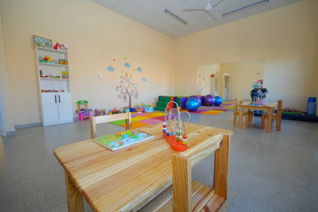 Además posee sanitarios para niños y niñas, sanitario común y para discapacitados, estimulación, rehabilitación; un Área de Diagnóstico y Aprendizaje, que cuenta con un consultorio – enfermería, aulas, sanitario para niños, sanitario común, y sanitario para discapacitados.