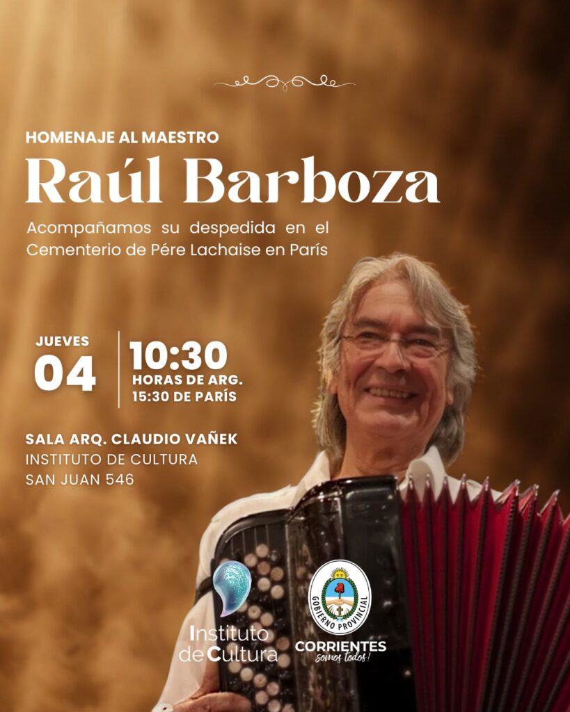 El Gobierno de la Provincia, a través del Instituto de Cultura de Corrientes, rendirá un sentido tributo a uno de los grandes embajadores del chamamé: el maestro Raúl Barboza. Este jueves 4 de septiembre, a las 10,30, se realizará un homenaje al músico en la Sala Vañek (San Juan 546), acompañando simbólicamente la despedida a sus restos en Francia.Se proyectará un material audiovisual sobre la vida y obra del notable compositor e intérprete, quien supo trascender fronteras con la música chamamecera. Y se espera que acompañen este momento, autoridades y artistas del género que desde siempre reconocen su virtuosismo y hoy su importante legado.De esta manera, la Nación Chamamecera acompañará a la distancia el último adiós al reconocido acordeonista que consistirá en un funeral breve, a cajón cerrado y sin ceremonia religiosa. La misma se llevará adelante, a las 15,30, en el cementerio del Père-Lachaise de Paris, Francia (10,30 horas de argentina). Allí será su descanso final, mismo lugar que guarda los restos de grandes artistas como Frédéric Chopin, Édith Piaf, María Callas, Georges Moustaki, Yves Montand.