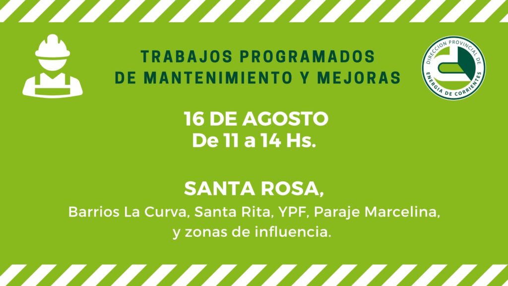 La Dirección Provincial de Energía de Corrientes (DPEC) informa que con motivo de realizar mejoras en el servicio, se ejecutarán tareas de mantenimiento e instalación de seccionamientos de Media Tensión, por lo cual se interrumpirá el suministro de energía eléctrica en las localidades de Goya, Empedrado, Paso de los Libres, y Santa Rosa, en sus respectivos días y horarios.