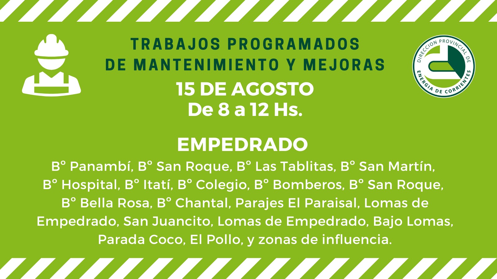 Asimismo en Empedrado, se realizará cambio de postes y poda sobre la traza de líneas de media tensión, este viernes 15, de 08 a 12 en los barrios Panambí, San Roque, Las Tablitas, San Martín, Hospital, Itatí, Colegio, Bomberos, San Roque, Bella Rosa, Chantal, Parajes El Paraisal, Lomas de Empedrado, Bajo Lomas, San Juancito, Parada Coco, El Pollo y zonas de influencia.