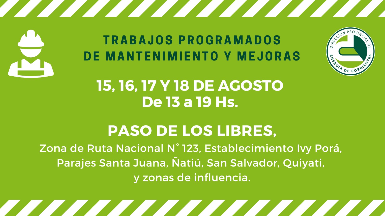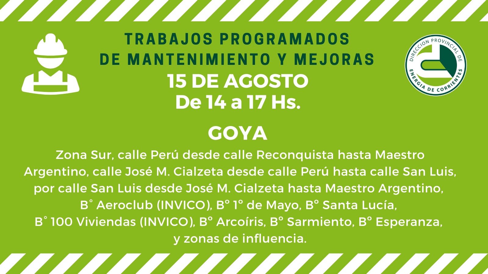 La Dirección Provincial de Energía de Corrientes (DPEC) informa que con motivo de realizar mejoras en el servicio, se ejecutarán tareas de mantenimiento e instalación de seccionamientos de Media Tensión, por lo cual se interrumpirá el suministro de energía eléctrica en las localidades de Goya, Empedrado, Paso de los Libres, y Santa Rosa, en sus respectivos días y horarios.