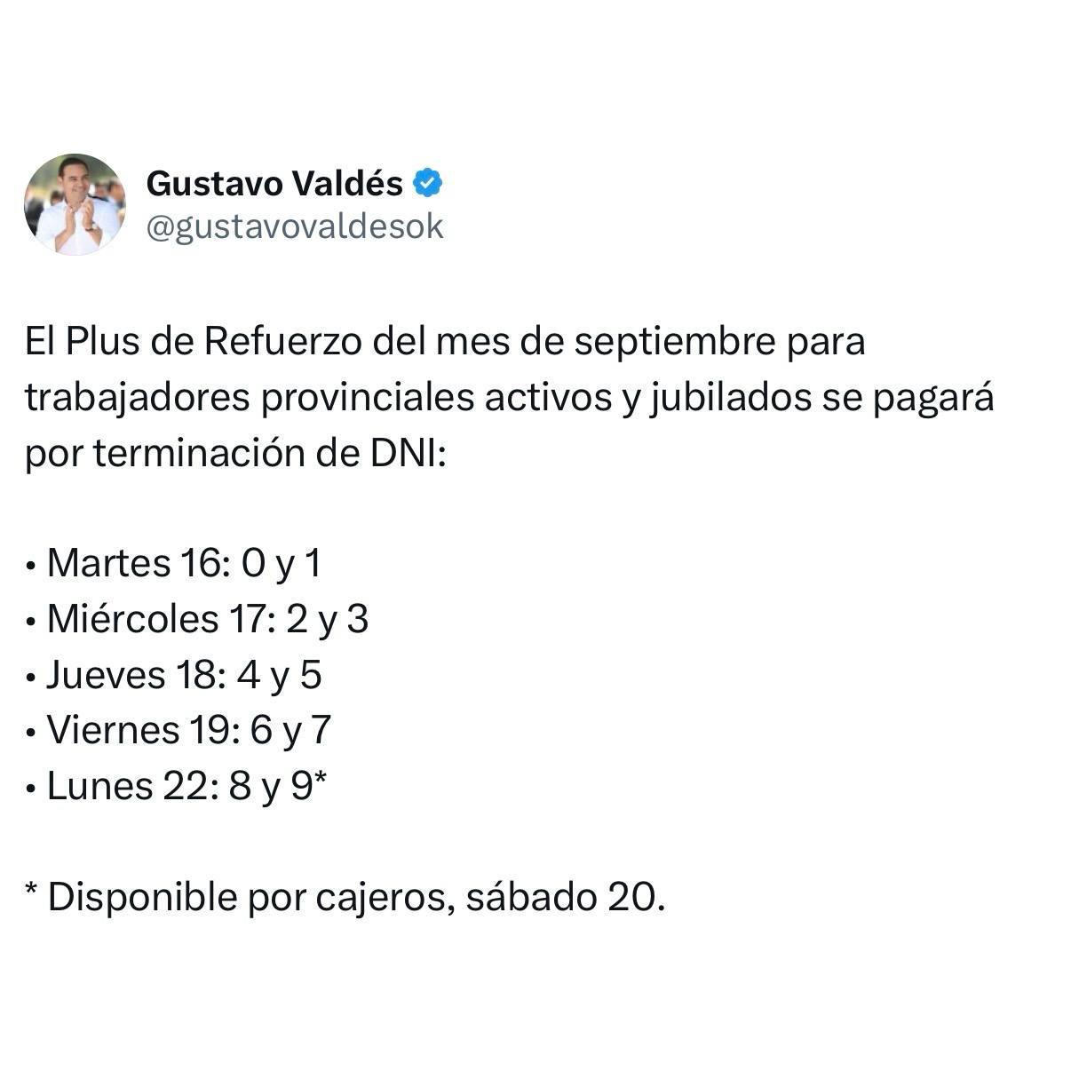 El primer mandatario provincial Gustavo Valdés dio a conocer los días de pago del Plus de Refuerzo de $100 mil de septiembre, entre este martes 16 y lunes 22. El beneficio alcanza a los agentes activos, jubilados y pensionados.