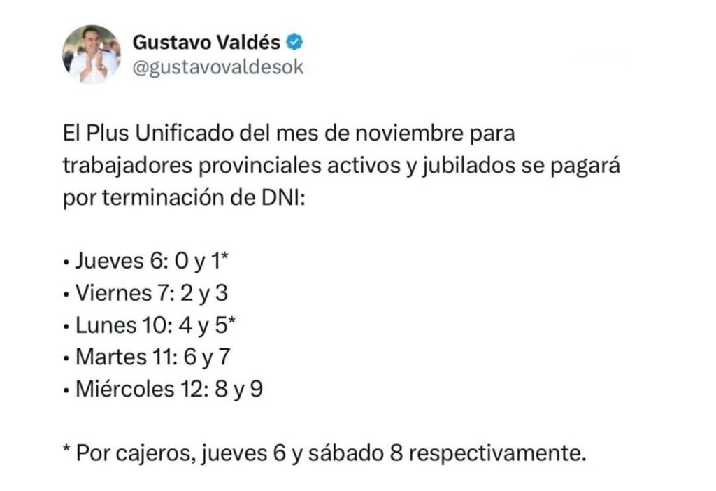 El primer Mandatario provincial Gustavo Valdés confirmó el pago del Adicional Remunerativo Mensual (Plus Unificado) de $110 mil correspondiente a noviembre; el beneficio, que conforma el Ingreso Salarial Mensual, alcanza a los agentes de la administración pública provincial, activos, jubilados y pensionados. Comienza este jueves 6 y se extiende hasta el miércoles 12, inclusive.