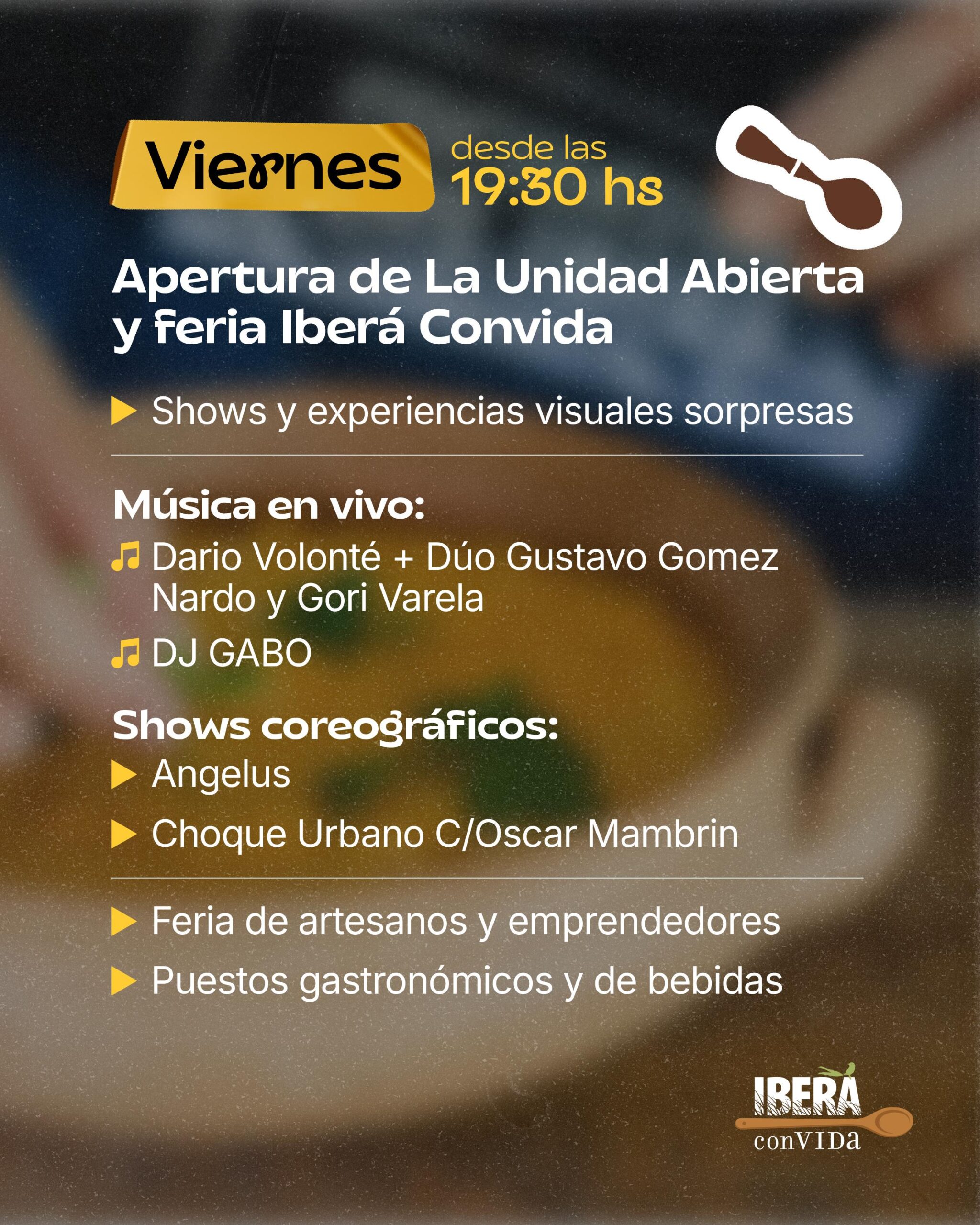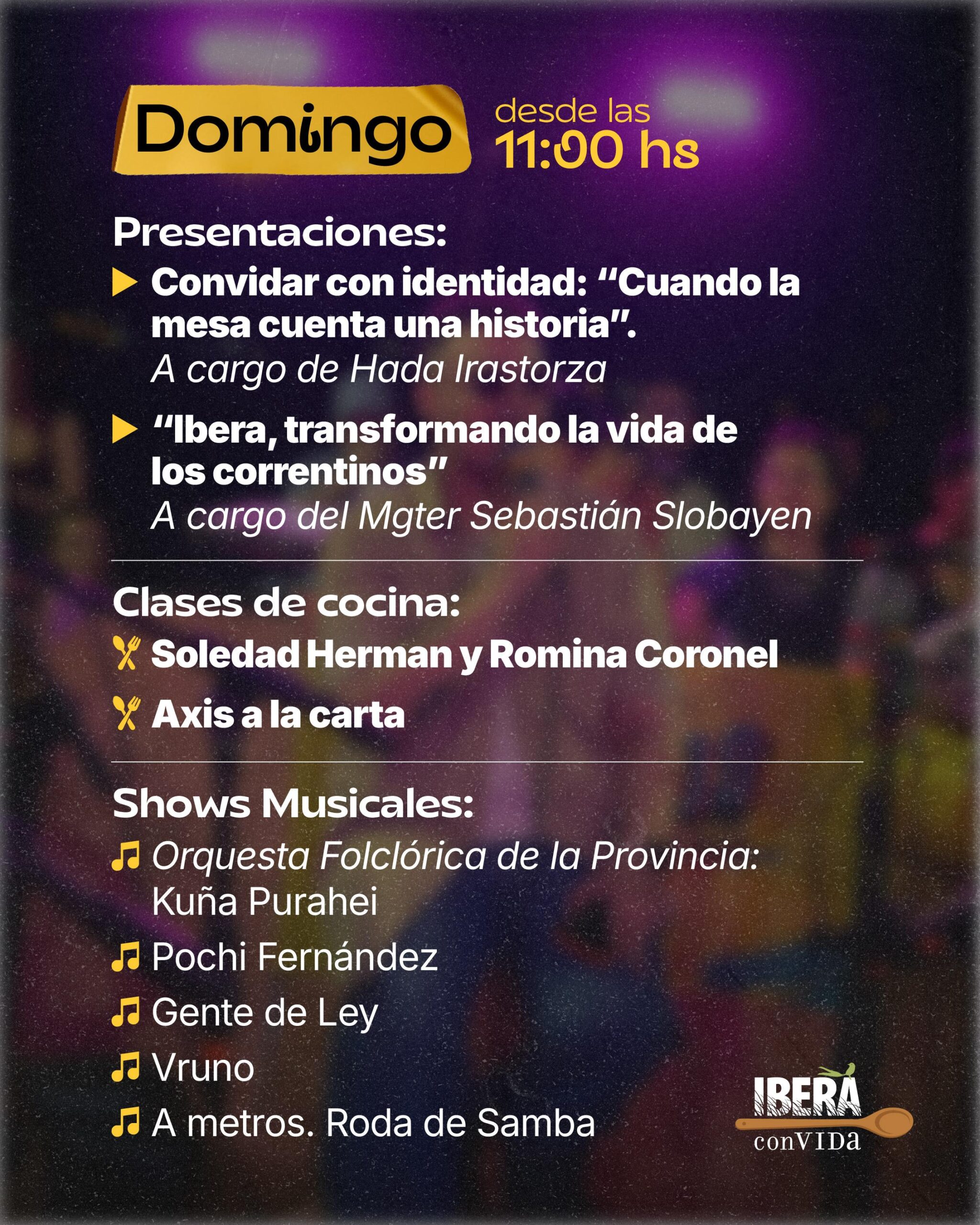 Se trata de Iberá Convida, donde los cocineros de cada portal del Iberá junto a los artesanos más representativos de las distintas localidades y otros invitados, mostrarán la esencia de la identidad correntina en sus platos y creaciones. Experiencias musicales y tecnológicas complementan la oferta durante sábado y domingo, con una gran apertura prevista para el viernes por la tarde que promete «sorprender» y «hacer brillar» el lugar y la propuesta.